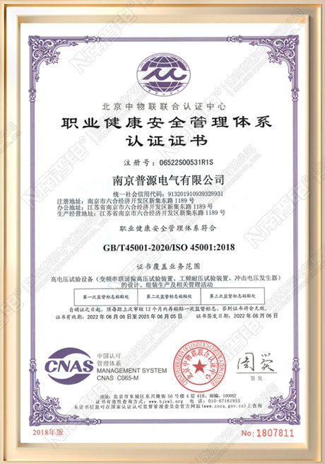 职业健康安全管理体系认证证书