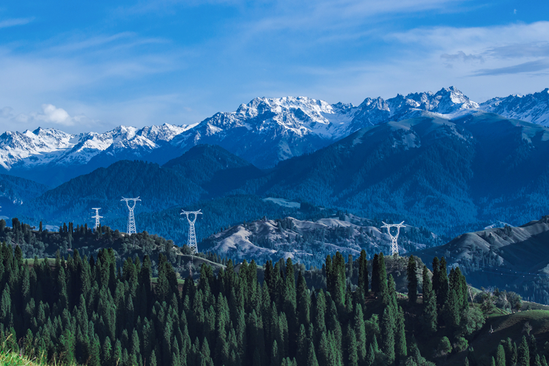 鸟瞰广袤的新疆大地,一座座巍峨的铁塔牵引着一条条闪耀的银线绵延千里,跨越天山南北,编织成一张纵横交错的电网。新疆750千伏电网东至哈密,西到博州、伊犁,南延喀什、和田,北联阿勒泰。截至目前,全疆已建成750千伏变电站28座,输电线路总长度达到1.03万千米,新疆成为全国750千伏变电站最多、750千伏线路最长、覆盖面积最大的省级电网,实现了新疆东部与西部、南疆与北疆在昼夜、季节上风光互补、电力互济,全疆资源优势配置能力大幅提升。
