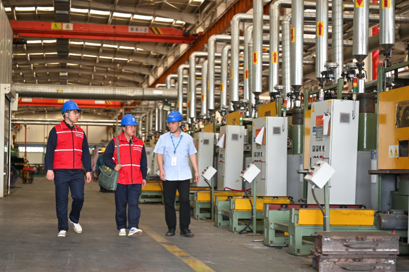 国网河北电力员工在衡水丰泽橡胶股份有限公司了解企业用电情况,优化用电方案。