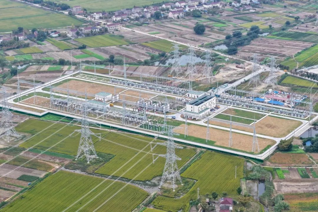 矗立在一片绿色田地中的海阳变电站