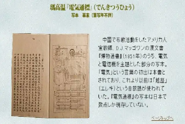 在日本东京电机大学综合媒体中心的网页上,有一张《博物通书》手抄本的照片,照片右侧的文字非常明确地指出“电气”一词来自中国的汉文西书。